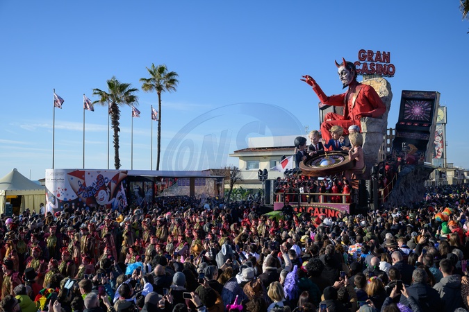 First masked parade of the Viareggio Carnival 2026. In the photo, the first category float "Gran Casino. Rien ne va plus" by Lebigre and Roger with caricatures of Trump, Putin, Xi Jinping playing roulette. . Viareggio, Italy 01 Feb 2026, Credit:Stefano Dalle Luche / Avalon