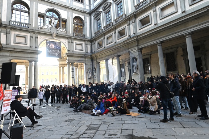 February 1, 2026, Florence. Tomaso Montanari held an open art history lecture in front of the Uffizi Gallery entrance. This initiative was held in support of the Uffizi Gallery's long-time temporary workers who are now unemployed. The event, attended by several hundred people, was organized by SUDD (Union of Democracy and Dignity), COBAS, and Arci Firenze..., Credit:Aleandro Biagianti / Avalon