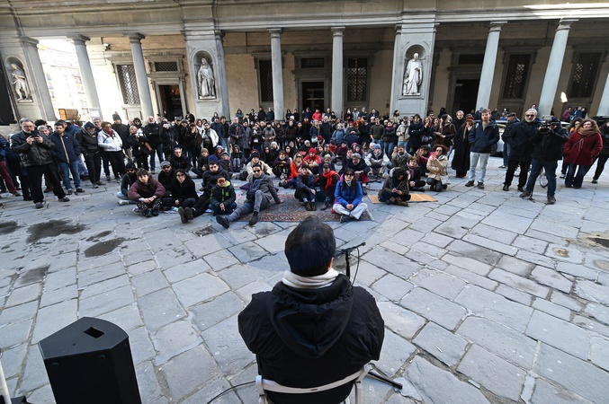 February 1, 2026, Florence. Tomaso Montanari held an open art history lecture in front of the Uffizi Gallery entrance. This initiative was held in support of the Uffizi Gallery's long-time temporary workers who are now unemployed. The event, attended by several hundred people, was organized by SUDD (Union of Democracy and Dignity), COBAS, and Arci Firenze..., Credit:Aleandro Biagianti / Avalon