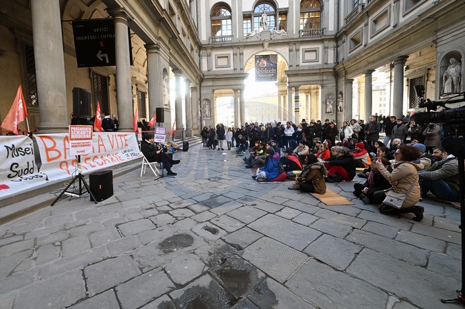 February 1, 2026, Florence. Tomaso Montanari held an open art history lecture in front of the Uffizi Gallery entrance. This initiative was held in support of the Uffizi Gallery's long-time temporary workers who are now unemployed. The event, attended by several hundred people, was organized by SUDD (Union of Democracy and Dignity), COBAS, and Arci Firenze..., Credit:Aleandro Biagianti / Avalon