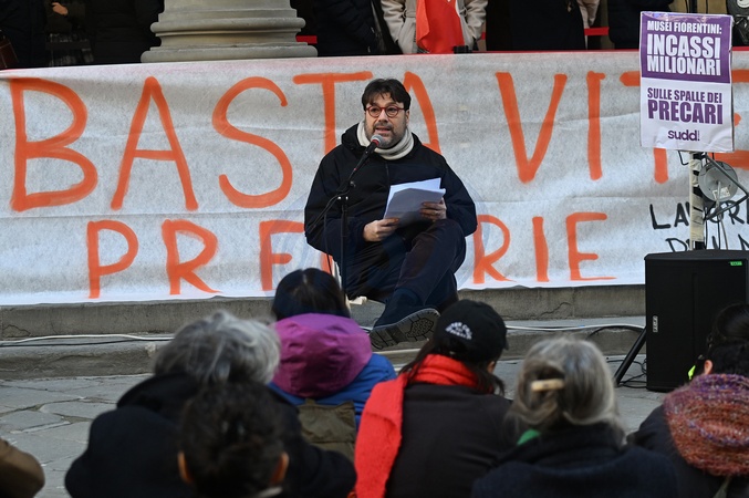 February 1, 2026, Florence. Tomaso Montanari held an open art history lecture in front of the Uffizi Gallery entrance. This initiative was held in support of the Uffizi Gallery's long-time temporary workers who are now unemployed. The event, attended by several hundred people, was organized by SUDD (Union of Democracy and Dignity), COBAS, and Arci Firenze..., Credit:Aleandro Biagianti / Avalon