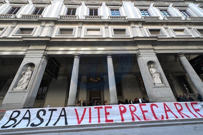 February 1, 2026, Florence. An art historian held an open lecture in front of the Uffizi Gallery entrance. This initiative was held in support of the Uffizi Gallery's long-time temporary workers who are now unemployed. The meeting, attended by several hundred people, was organized by SUDD (Union of Democracy and Dignity), COBAS, and Arci Firenze..., Credit:Aleandro Biagianti / Avalon
