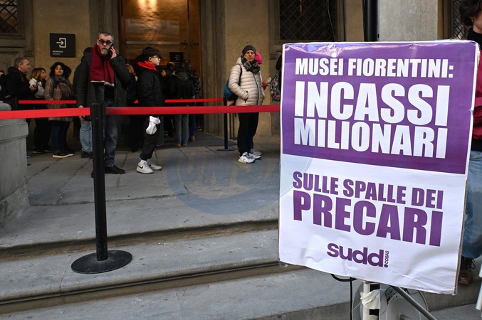 February 1, 2026, Florence. An art historian held an open lecture in front of the Uffizi Gallery entrance. This initiative was held in support of the Uffizi Gallery's long-time temporary workers, who are now unemployed. The meeting, attended by several hundred people, was organized by SUDD (Union of Democracy and Dignity), COBAS, and Arci Firenze. The sign read, "Florentine museums: millions in revenue earned on the backs of temporary workers.", Credit:Aleandro Biagianti / Avalon