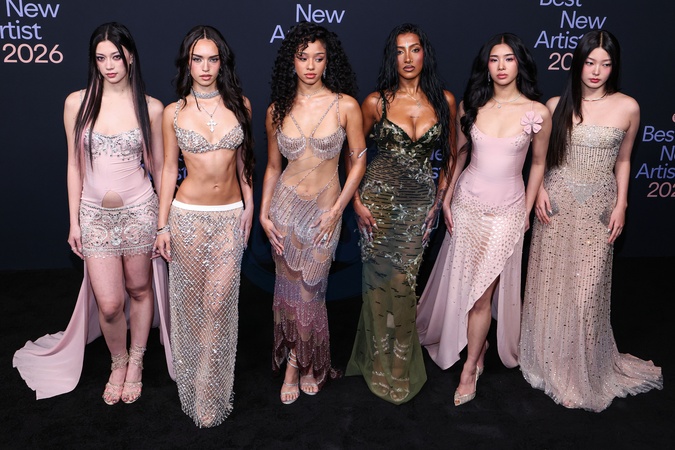 WEST HOLLYWOOD, LOS ANGELES, CALIFORNIA, USA - JANUARY 29: Megan, Daniela, Manon, Lara Raj, Sophia and Yoonchae of KATSEYE wearing Georges Hobeika and Rene Capvilla shoes arrive at Spotify's 2026 Best New Artist Party (68th Annual Grammy Awards) held at The Lot at Formosa on January 29, 2026 in West Hollywood, Los Angeles, California, United States., Credit:Kay Qiao / Avalon