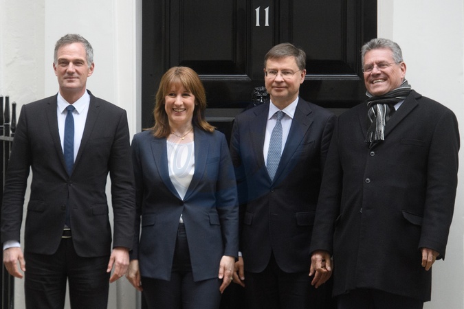 (L-R) - Peter Kyle - Secretary of State for Business and Trade, Rachel Reeves - Chancellor of The Exchequer, Valdis Dombrovskis - European Commissioner for Economy and Productivity, Maros Sefcovic - European Commissioner for Trade pose for a photo at Downing Street, London, England, UK on Monday 2 February, 2026., Credit:Justin Ng / Avalon