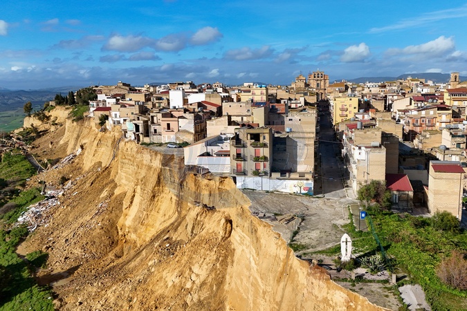 February 2, 2026, Niscemi (Caltanissetta). Another ten meters of erosion in seven days. The landslide advances inland, the collapses continue, and an entire building collapsed two days ago., Credit:FORTUNATE SERRANO' / Avalon