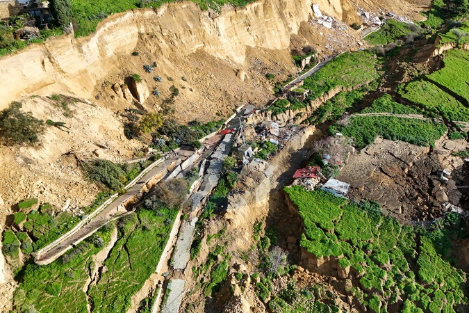 February 2, 2026, Niscemi (Caltanissetta). Another ten meters of erosion in seven days. The landslide advances inland, the collapses continue, and an entire building collapsed two days ago., Credit:FORTUNATE SERRANO' / Avalon