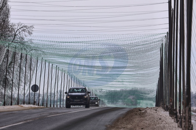 Cars move along the road that is being covered with an anti-drone net, Kharkiv region, February 2, 2026. Large protective nets are being erected around Kharkiv and along key logistics routes in the region to shield transport from Russian FPV drone attacks. As part of systemic security measures, these structures intercept UAVs by forming protective "corridors” over roads in the front-line region., Credit:Viacheslav Madiievskyiv / Avalon