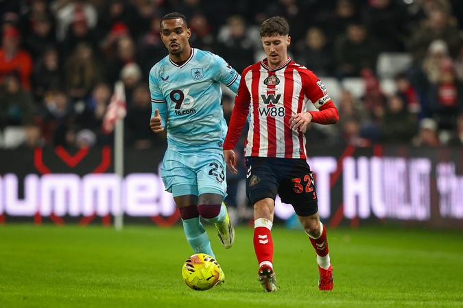 Trai Hume of Sunderland makes a run with the ball while chased by Lucas Pires of Burnley during the Premier League match Sunderland vs Burnley at Stadium Of Light, Sunderland, United Kingdom, 2nd February 2026, Credit:Ae Cosgrove/News Images / Avalon