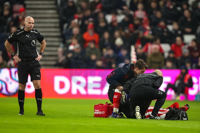 Referee Paul Tierney looks on as Nordi Mukiele of Sunderland receives treatment during the Premier League match Sunderland vs Burnley at Stadium Of Light, Sunderland, United Kingdom, 2nd February 2026, Credit:Ae Cosgrove/News Images / Avalon