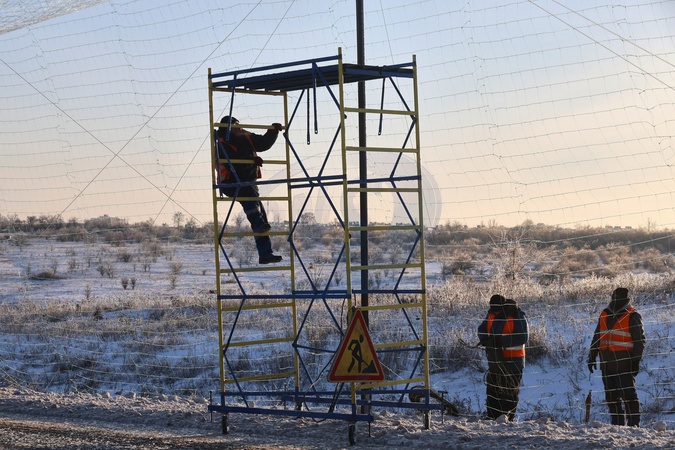 Workers install an anti-drone net over a road, Kharkiv region, February 2, 2026. Large protective nets are being erected around Kharkiv and along key logistics routes in the region to shield transport from Russian FPV drone attacks. As part of systemic security measures, these structures intercept UAVs by forming protective "corridors” over roads in the front-line region., Credit:Viacheslav Madiievskyiv / Avalon