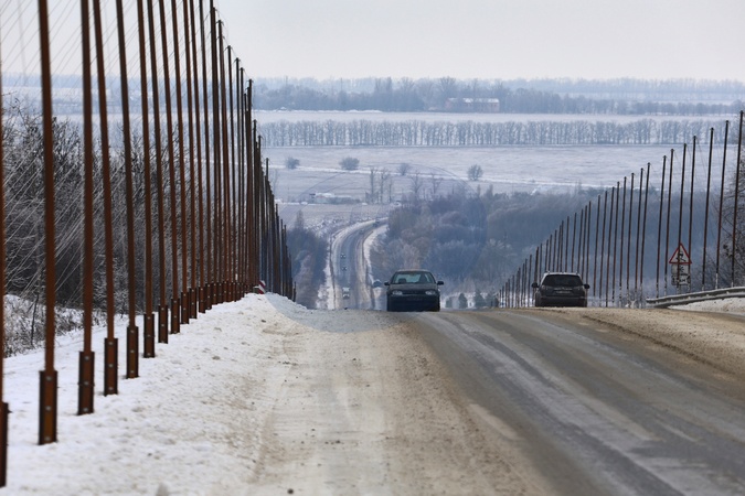 Cars drive past metal poles installed along the roadside for an anti-drone net, Kharkiv region, February 2, 2026. Large protective nets are being erected around Kharkiv and along key logistics routes in the region to shield transport from Russian FPV drone attacks. As part of systemic security measures, these structures intercept UAVs by forming protective "corridors” over roads in the front-line region., Credit:Viacheslav Madiievskyiv / Avalon
