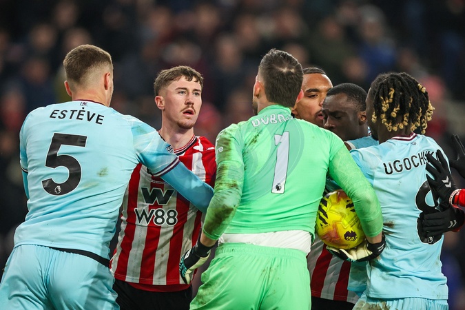 Trai Hume of Sunderland involved in an altercation withBurnley goalkeeper Martin Dubravka during the Premier League match Sunderland vs Burnley at Stadium Of Light, Sunderland, United Kingdom, 2nd February 2026, Credit:Ae Cosgrove/News Images / Avalon