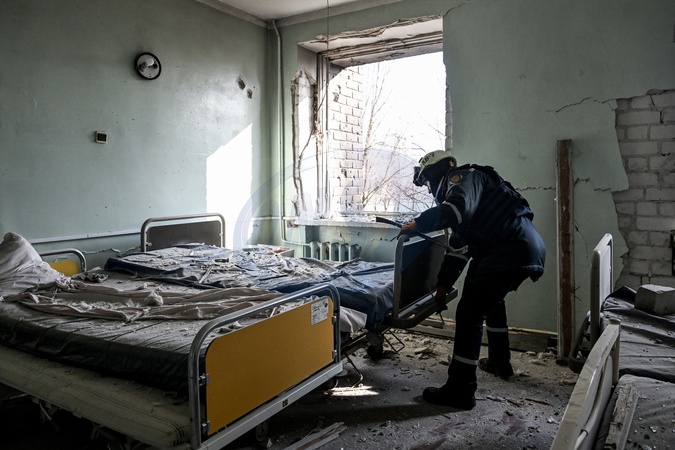 A rescuer works inside a maternity hospital ward after a Russian drone attack damaged the medical facility in Zaporizhzhia, Ukraine, on February 1, 2026. A fire broke out on one of the floors, leaving at least six people injured, Credit:Dmytro Smolienko / Avalon