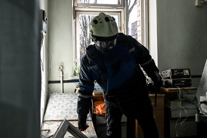 A rescuer works inside a maternity hospital ward after a Russian drone attack damaged the medical facility in Zaporizhzhia, Ukraine, on February 1, 2026. A fire broke out on one of the floors, leaving at least six people injured, Credit:Dmytro Smolienko / Avalon
