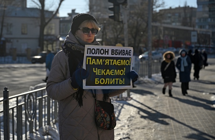 A woman holds a placard with a slogan during the "Don't Be Silent! Captivity Kills” rally held to draw attention to prisoners of war from the Mariupol garrison, all prisoners of war and missing Ukrainian defenders in Kyiv, Ukraine, on February 1, 2026, Credit:Yevhen Kotenko / Avalon