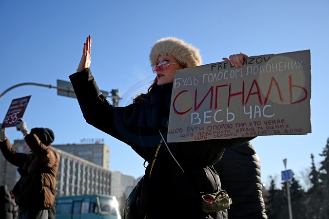 A woman holds a placard with a slogan during the "Don't Be Silent! Captivity Kills” rally held to draw attention to prisoners of war from the Mariupol garrison, all prisoners of war and missing Ukrainian defenders in Kyiv, Ukraine, on February 1, 2026, Credit:Yevhen Kotenko / Avalon