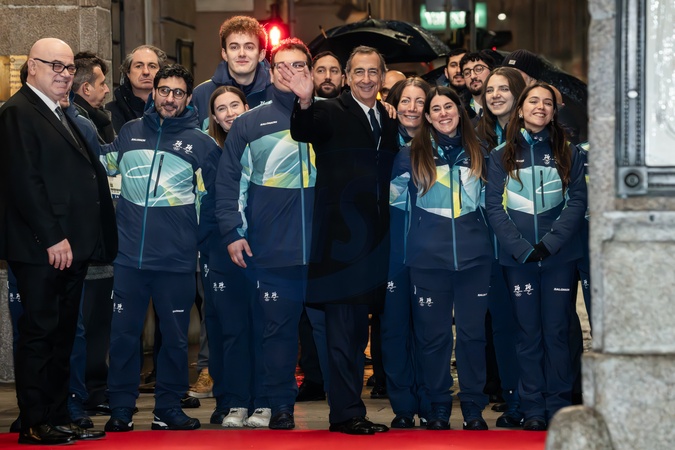 February 2, 2026, Milan. Piazza Scala, Arrival of Olympic delegations for the Opening Ceremony of the 145th IOC Session. On the left, Fortunato Ortombina, Superintendent and Artistic Director of the Teatro alla Scala, and Giuseppe Sala, Mayor of Milan., Credit:Nicola Marfisi / Avalon