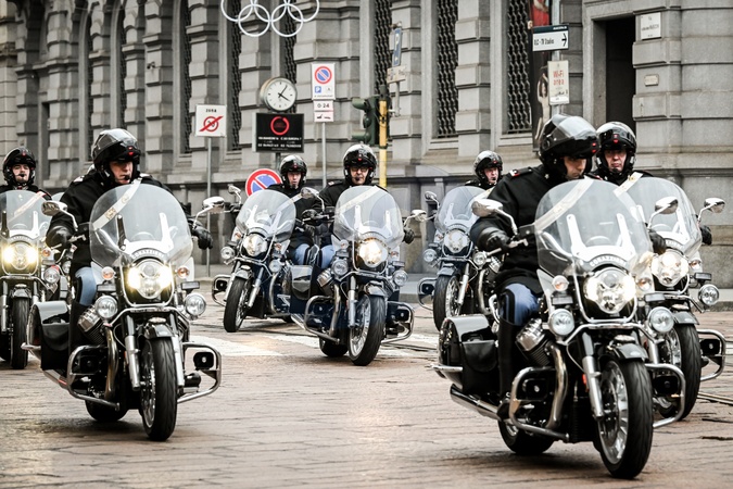February 2, 2026, Milan. Piazza Scala, Olympic delegations arrive for the Opening Ceremony of the 145th IOC Session. Motorcycle Cuirassiers, the President of the Italian Republic's elite honor guard, and a specialized force of the Carabinieri., Credit:Nicola Marfisi / Avalon