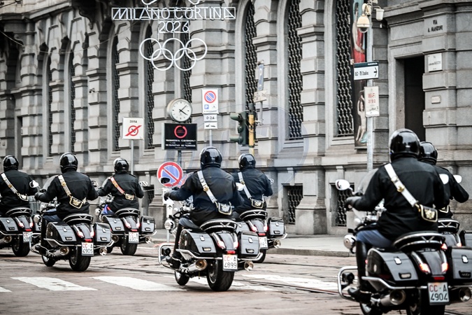 February 2, 2026, Milan. Piazza Scala, Olympic delegations arrive for the Opening Ceremony of the 145th IOC Session. Motorcycle Cuirassiers, the President of the Italian Republic's elite honor guard, and a specialized force of the Carabinieri., Credit:Nicola Marfisi / Avalon