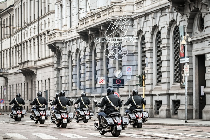 February 2, 2026, Milan. Piazza Scala, Olympic delegations arrive for the Opening Ceremony of the 145th IOC Session. Motorcycle Cuirassiers, the President of the Italian Republic's elite honor guard, and a specialized force of the Carabinieri., Credit:Nicola Marfisi / Avalon