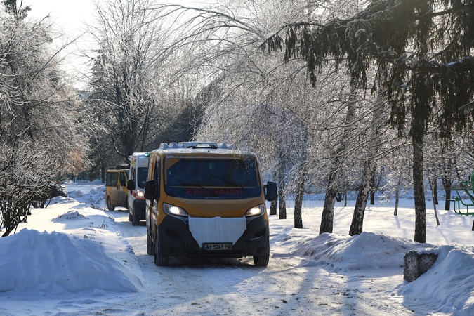 Munibuses with evacuees from the Vovchansk district arrive at a transit centre for internally displaced persons in Kharkiv, Ukraine, February 2, 2026. Volunteers and police have evacuated dozens of civilians from the Vovchansk district in northeastern Kharkiv region following an escalation of hostilities., Credit:Viacheslav Madiievskyi / Avalon