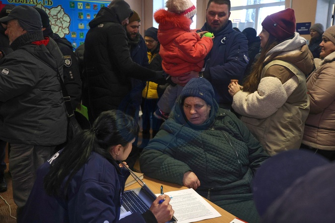A manager advises an elderly woman at a transit centre for internally displaced persons in Kharkiv, Ukraine, February 2, 2026. Volunteers and police have evacuated dozens of civilians from the Vovchansk district in northeastern Kharkiv region following an escalation of hostilities., Credit:Viacheslav Madiievskyi / Avalon