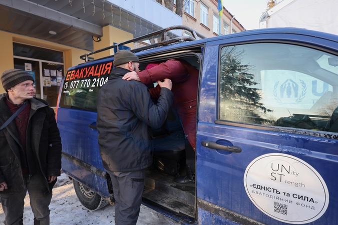 A man assists an elderly woman out of a van upon arrival at a transit centre for internally displaced persons in Kharkiv, Ukraine, February 2, 2026. Volunteers and police have evacuated dozens of civilians from the Vovchansk district in northeastern Kharkiv region following an escalation of hostilities., Credit:Viacheslav Madiievskyi / Avalon