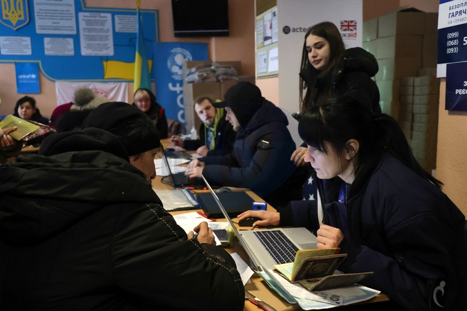 A manager advises an elderly woman at a transit centre for internally displaced persons in Kharkiv, Ukraine, February 2, 2026. Volunteers and police have evacuated dozens of civilians from the Vovchansk district in northeastern Kharkiv region following an escalation of hostilities., Credit:Viacheslav Madiievskyi / Avalon