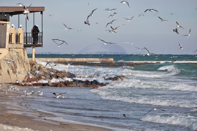 Seagulls hover above the beach as people look out into the Black Sea on a sunny winter day, Odesa, Ukraine, February 2, 2026., Credit:Nina Liashonok / Avalon