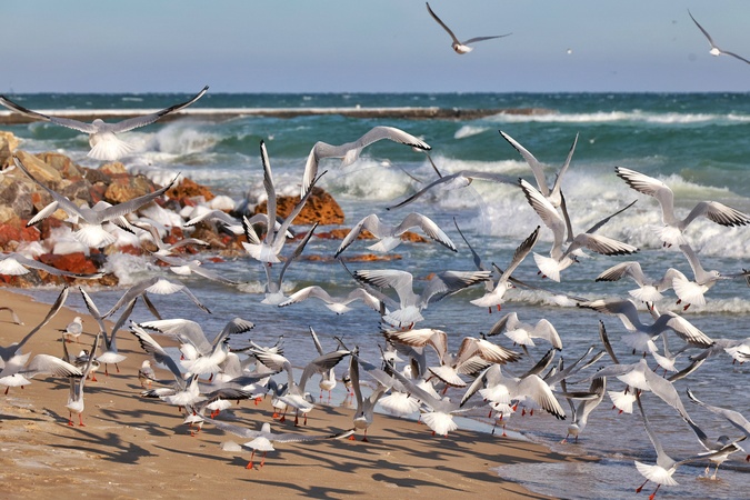 Seagulls fly take off from a beach by the Black Sea on a sunny winter day, Odesa, Ukraine, February 2, 2026., Credit:Nina Liashonok / Avalon