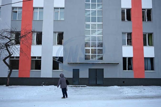 A woman looks at Gymnasium No. 126 in Kyiv's Dniprovskyi district, damaged by an overnight Russian drone strike, Kyiv, Ukraine, February 3, 2026. Russia's massive nighttime attack on Kyiv's energy infrastructure left part of the city's left bank without heating. The most difficult situation is in the Darnytskyi and Dniprovskyi districts. Emergency power outages have also been implemented on the left bank., Credit:Yevhen Kotenko / Avalon