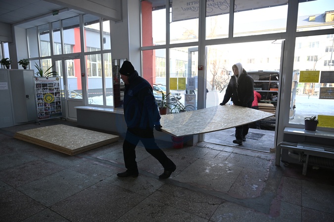 Men bring particle boards inside Gymnasium No. 126 in Kyiv's Dniprovskyi district to seal windows smashed by an overnight Russian drone strike, Kyiv, Ukraine, February 3, 2026. Russia's massive nighttime attack on Kyiv's energy infrastructure left part of the city's left bank without heating. The most difficult situation is in the Darnytskyi and Dniprovskyi districts. Emergency power outages have also been implemented on the left bank., Credit:Yevhen Kotenko / Avalon