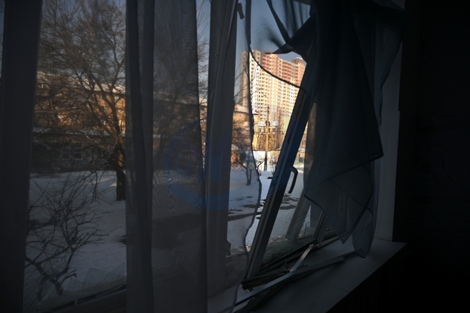 Windows shattered by the blast wave are in the canteen at Gymnasium No. 126 in Kyiv's Dniprovskyi district, following an overnight Russian drone strike, Kyiv, Ukraine, February 3, 2026. Russia's massive nighttime attack on Kyiv's energy infrastructure left part of the city's left bank without heating. The most difficult situation is in the Darnytskyi and Dniprovskyi districts. Emergency power outages have also been implemented on the left bank., Credit:Yevhen Kotenko / Avalon