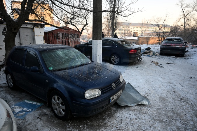 Damaged cars are parked near a five-storey apartment block hit by a Russian drone in the Dniprovskyi district of Kyiv, Ukraine, February 3, 2026. Russia's massive nighttime attack on Kyiv's energy infrastructure left part of the city's left bank without heating. The most difficult situation is in the Darnytskyi and Dniprovskyi districts. Emergency power outages have also been implemented on the left bank., Credit:EVGEN_KOTENKO / Avalon