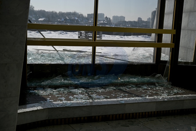 Windows shattered as a result of Russian shelling in the Hall of Fame of the National Museum of the History of Ukraine in the Second World War beneath the Motherland Monument, Kyiv, Ukraine, on February 3, 2026, Credit:Yevhen Kotenko / Avalon