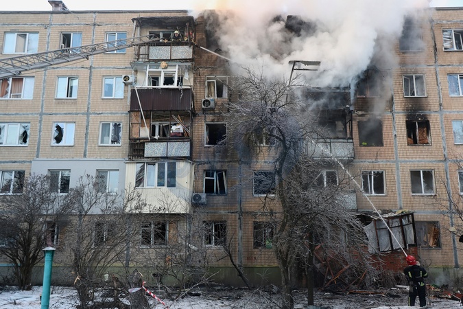 A SES firefighter works to put out a fire in an apartment of a five-story residential building following a Russian drone strike, Kharkiv, Ukraine, on February 3, 2026, Credit:Viacheslav Madiievskyi / Avalon