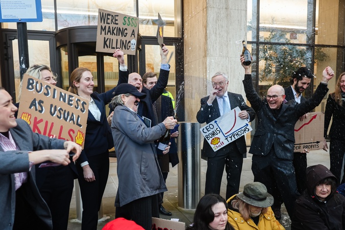 Activists dressed as shareholders stage a mock ‘profits party' outside Shell's headquarters in London, UK, on 04 February 2026, while other protesters display images of climate devastation during a demonstration timed with the company's annual profits announcement., Credit:Pete Speller / Avalon