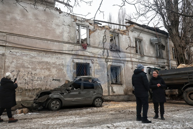 People stay outside a two-storey apartment block damaged in a Russian drone attack, Odesa, Ukraine, February 4, 2026. Five people were injured in the overnight strike on the southern port city, which also damaged residential buildings as well as civil and industrial infrastructure., Credit:Nina Liashonok / Avalon