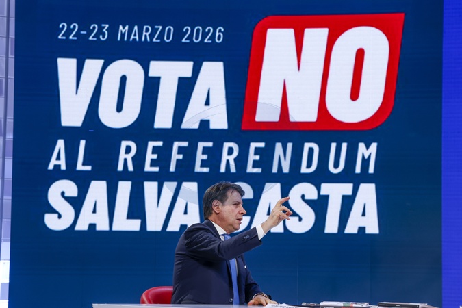 February 4, 2026, Rome, La7, TV show L'Aria che Tira, photo by Giuseppe Conte, behind the sign "Vote no to the referendum to save the caste.", Credit:Cristiano Minichiello / Avalon