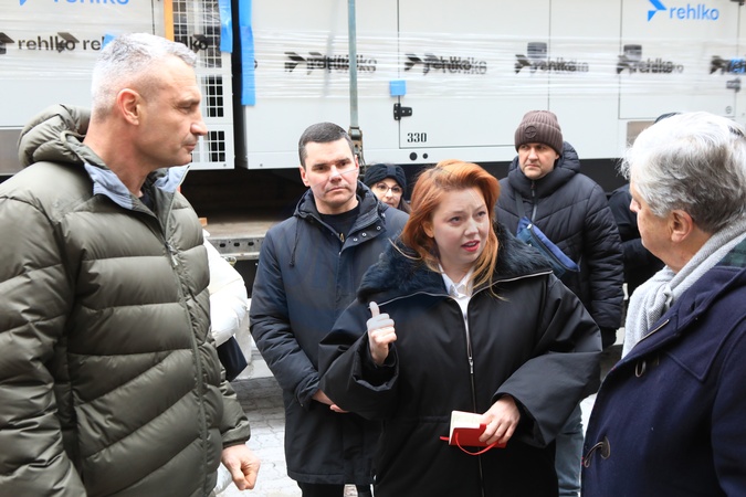 Kyiv city head Vitali Klitschko, First Deputy Minister for Development of Communities and Territories of Ukraine Alona Shkrum and Minister Delegate to France's Minister for Europe and Foreign Affairs for Foreign Trade and Attractiveness Nicolas Forissier (L to R) participate in the handover of the first 30 generators from the Crisis and Support Centre of the French Ministry for Europe and Foreign Affairs to the Kyivteploenerho Communal Enterprise, a heating and electricity provider supplying centralized heating and hot water to residents and businesses of Kyiv, under the EU Civil Protection Mechanism, Kyiv, Ukraine, February 4, 2026., Credit:Volodymyr Tarasov / Avalon