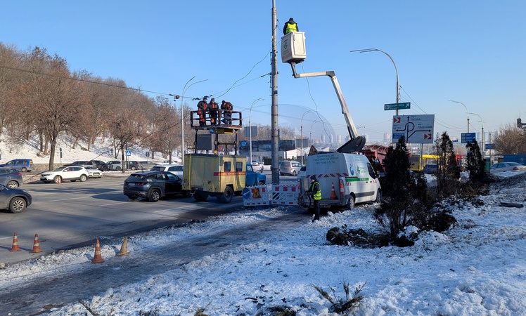 Utility workers repair the public transport power network damaged by a Russian drone strike on the territory of a gas station on Mykhnovskyi Boulevard in the Pecherskyi district of Kyiv, Ukraine, on February 3, 2026, Credit:Yevhen Kotenko / Avalon