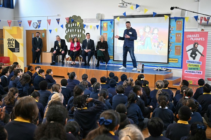 Britain's Queen Camilla (at R-seated on stage) listens to British children's author Chris Smith (R) speak to pupils as she attends the opening of a library at Christ Church Primary School in London on February 4, 2026, to help mark the "National Year of Reading"., Credit:JUSTIN TALLIS / Avalon