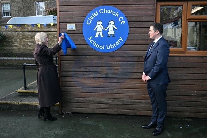 Britain's Queen Camilla (L) unveils a new plaque as she attends the opening of a library at Christ Church Primary School in London on February 4, 2026, to help mark the "National Year of Reading" and meet with pupil librarians., Credit:JUSTIN TALLIS / Avalon