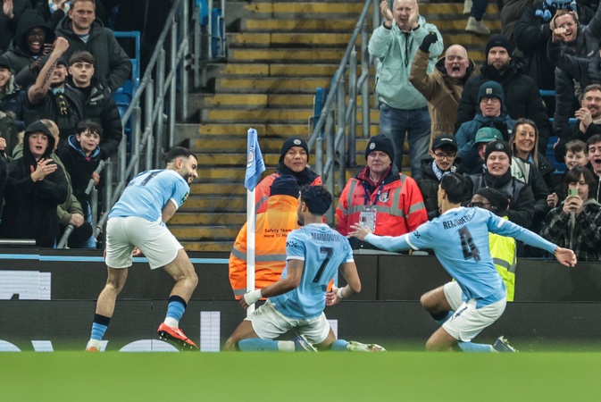 Omar Marmoush of Manchester City celebrates his goal to make it 1-0 during the Carabao Cup Semi-Final second leg match Manchester City vs Newcastle United at Etihad Stadium, Manchester, United Kingdom, 4th February 2026, Credit:Mark Cosgrove/News Images / Avalon