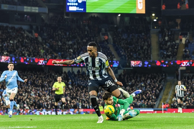 Manchester City goalkeeper James Trafford slides in on Joe Willock of Newcastle Untied during the Carabao Cup Semi-Final second leg match Manchester City vs Newcastle United at Etihad Stadium, Manchester, United Kingdom, 4th February 2026, Credit:Mark Cosgrove/News Images / Avalon