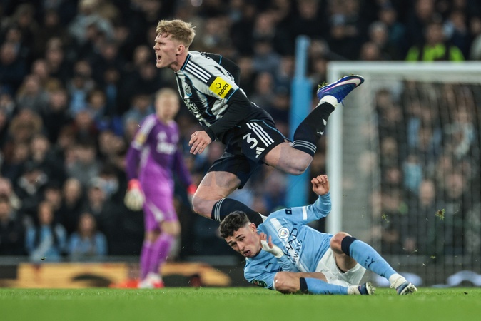 Lewis Hall of Newcastle Untied fouled by Phil Foden of Manchester City during the Carabao Cup Semi-Final second leg match Manchester City vs Newcastle United at Etihad Stadium, Manchester, United Kingdom, 4th February 2026, Credit:Mark Cosgrove/News Images / Avalon