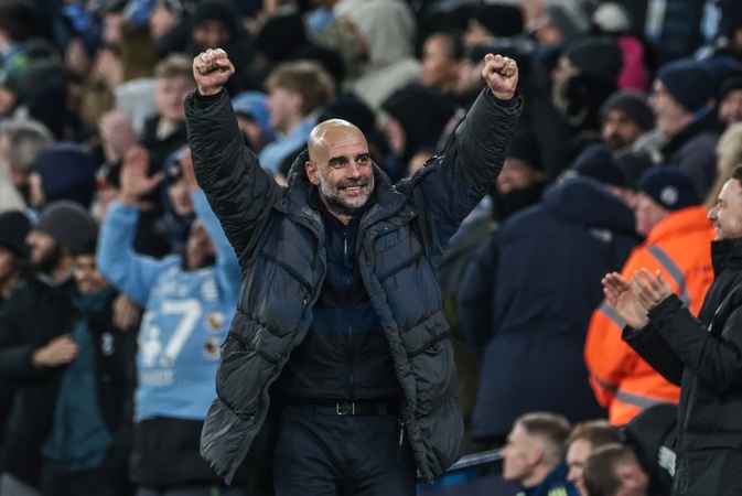 Pep Guardiola manager of Manchester City celebrates a goal from Tijjani Reijnders of Manchester City making it 3-0 during the Carabao Cup Semi-Final second leg match Manchester City vs Newcastle United at Etihad Stadium, Manchester, United Kingdom, 4th February 2026, Credit:Mark Cosgrove/News Images / Avalon