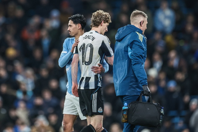 Tijjani Reijnders of Manchester City embraces Anthony Gordon of Newcastle Untied as he comes off injured during the Carabao Cup Semi-Final second leg match Manchester City vs Newcastle United at Etihad Stadium, Manchester, United Kingdom, 4th February 2026, Credit:Mark Cosgrove/News Images / Avalon