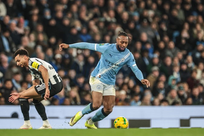 Antonie Semenyo of Manchester City breaks with the ball during the Carabao Cup Semi-Final second leg match Manchester City vs Newcastle United at Etihad Stadium, Manchester, United Kingdom, 4th February 2026, Credit:Mark Cosgrove/News Images / Avalon
